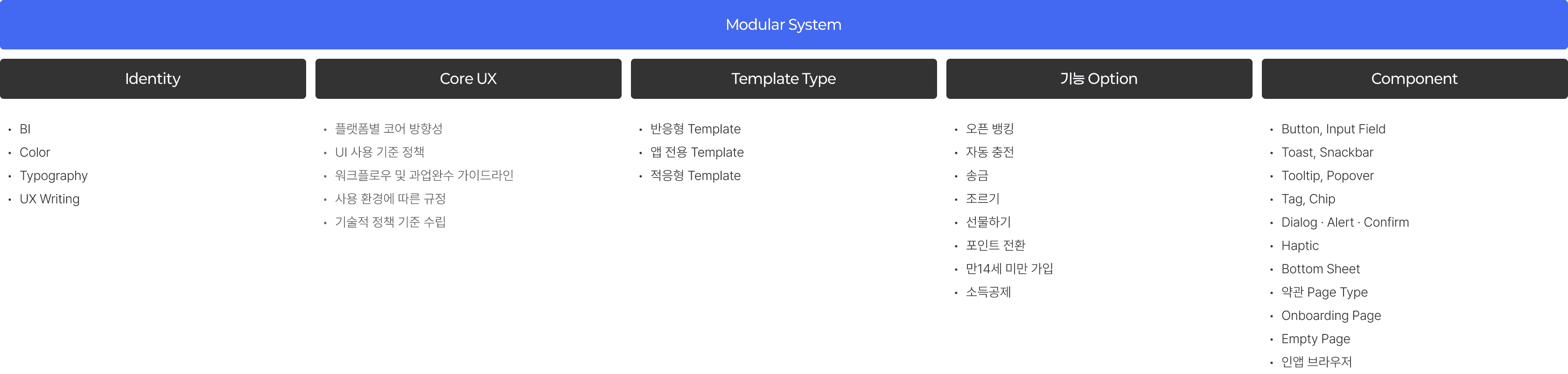 충전 계좌 등록, 연말정산(소득공제) 신청 관리, 만 14세 미만 친권 확인 화면 등 핵심 기능 영역을 모듈화하여, 서로 다른 환경의 결제 플랫폼 에서도 각 브랜드의 컬러와