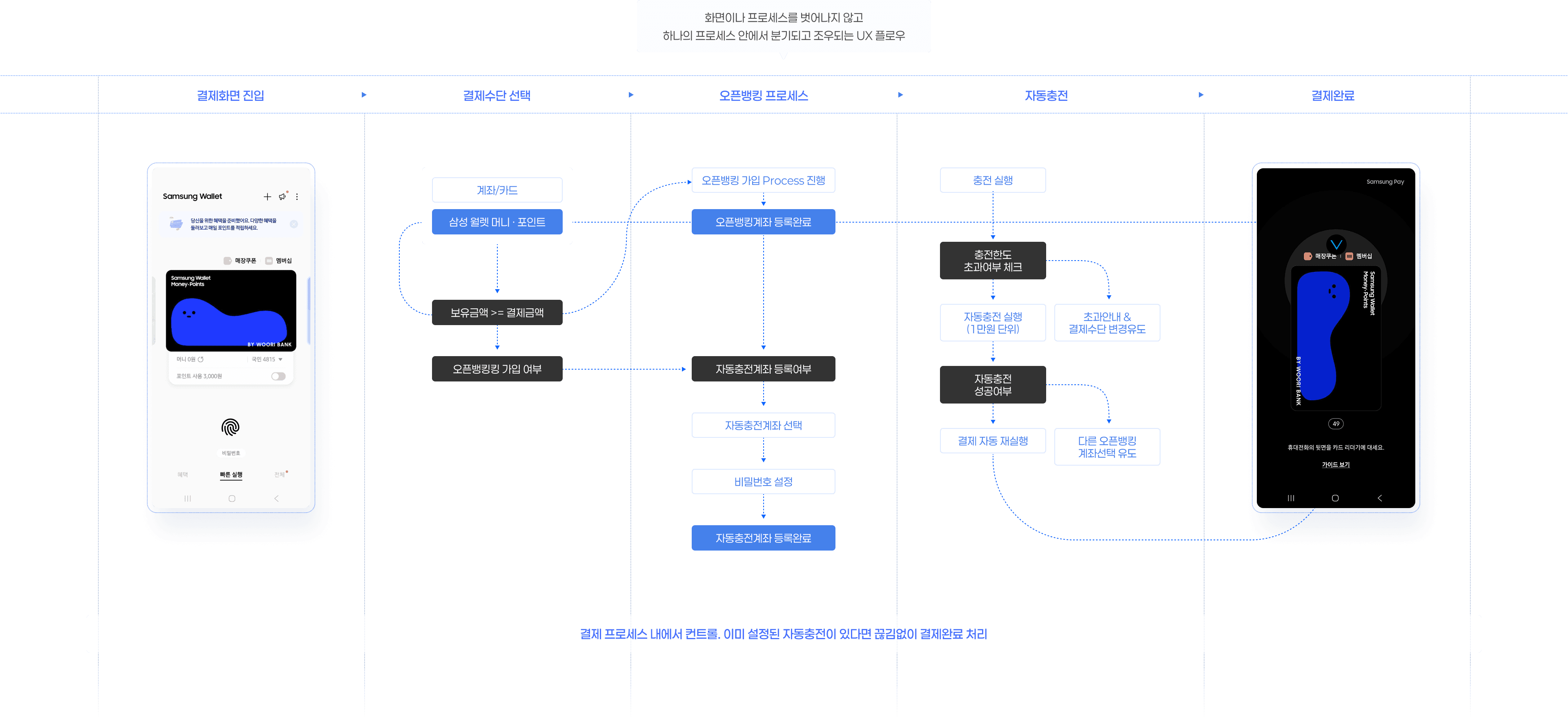 이 모든 과정은 삼성월렛의 시각 언어와 상호작용 패턴을 일관되게 유지하면서도 새로운 금융 기능을 자연스럽게 이용할 수 있도록 구성되었습니다.